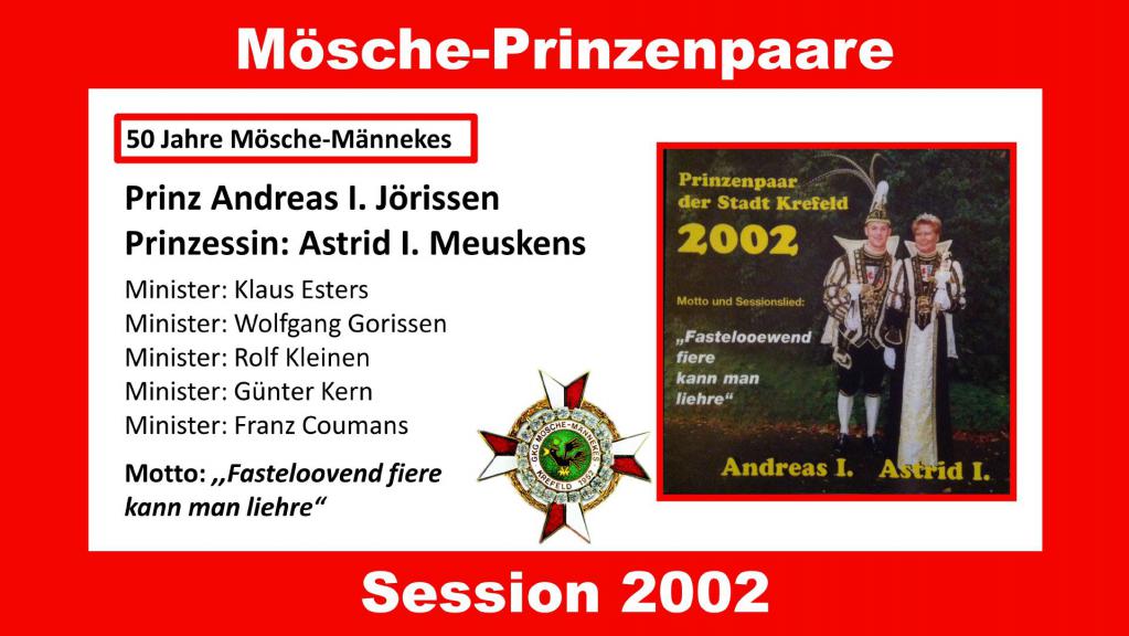 Nebenbei bemerkt: : Die "Mösch" (der Spatz) im Jahr 2002 vom Naturschutzbund zum Vogel des Jahres gewählt wurde. In diesem Jahr stellten die Mösche-Männekes ein Prinzenpaar und feierten ihr 50-jähriges Jubiläum.